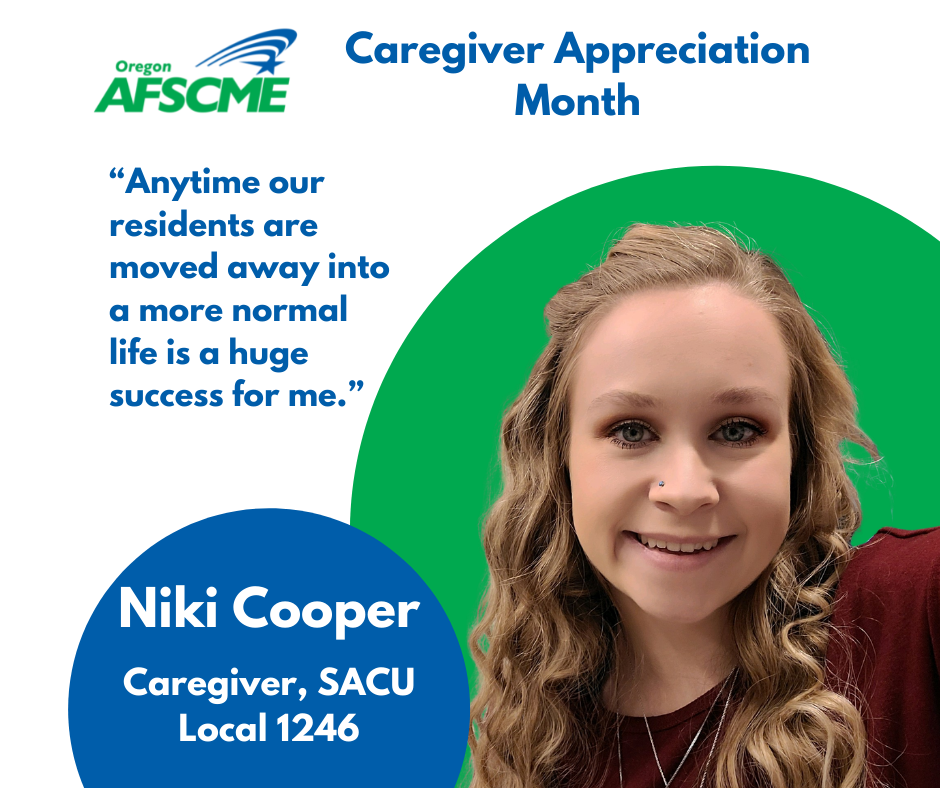 Niki Cooper is a caregiver and Oregon AFSCME Local 1246 member, and during March’s caregiver Appreciation Month, we are honored to showcase her story.